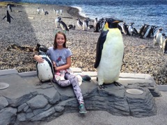 Sierra and some life-sized penguins at Aquarium of the Pacific.